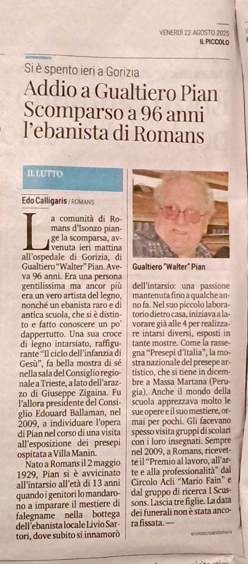 Gualtiero Pian, intarsiatore-ebanista, firmava le sue opere con il suo cognome "PIAN", mancato nell'agosto 2025. Viveva ed operara nel suo laboratorio a Romans d'Isonzo (GO).