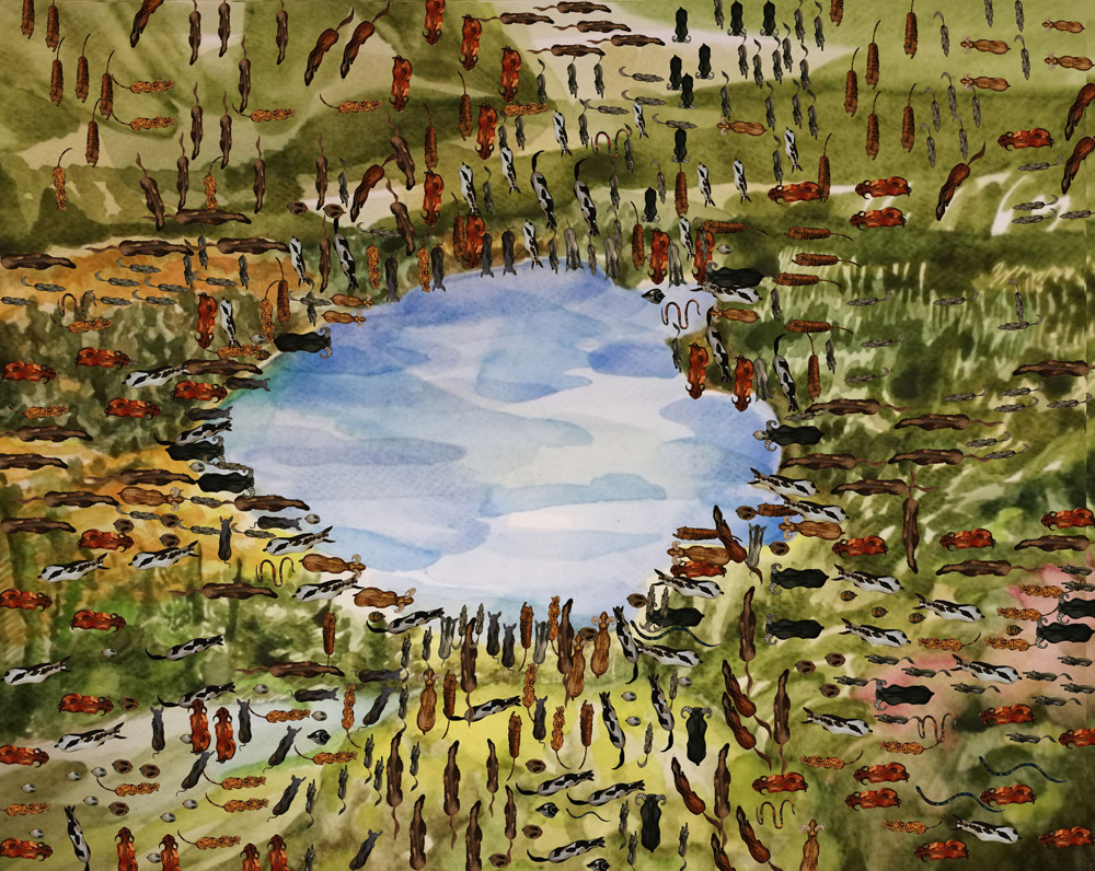 MESSAGGIO: ‘Water Party’ è uno specchio d’acqua visto dall’alto. Molti animali di varie razze, taglie, provenienza e colore si sono avvicinati e stanno bevendo.